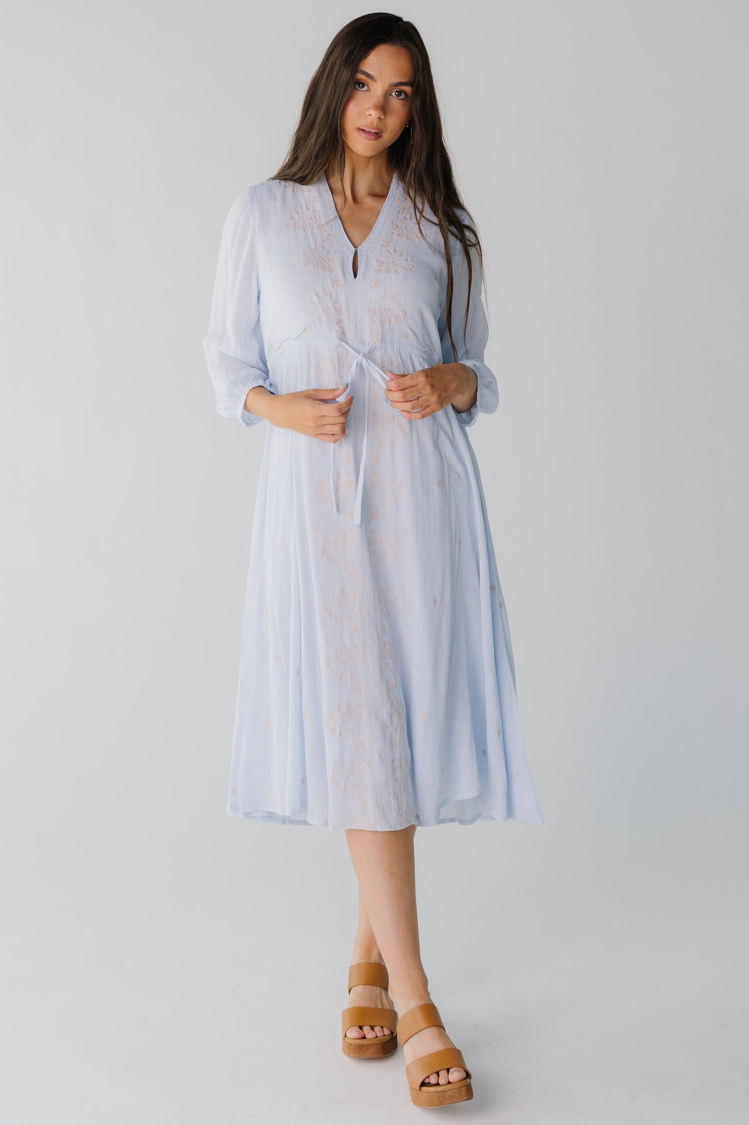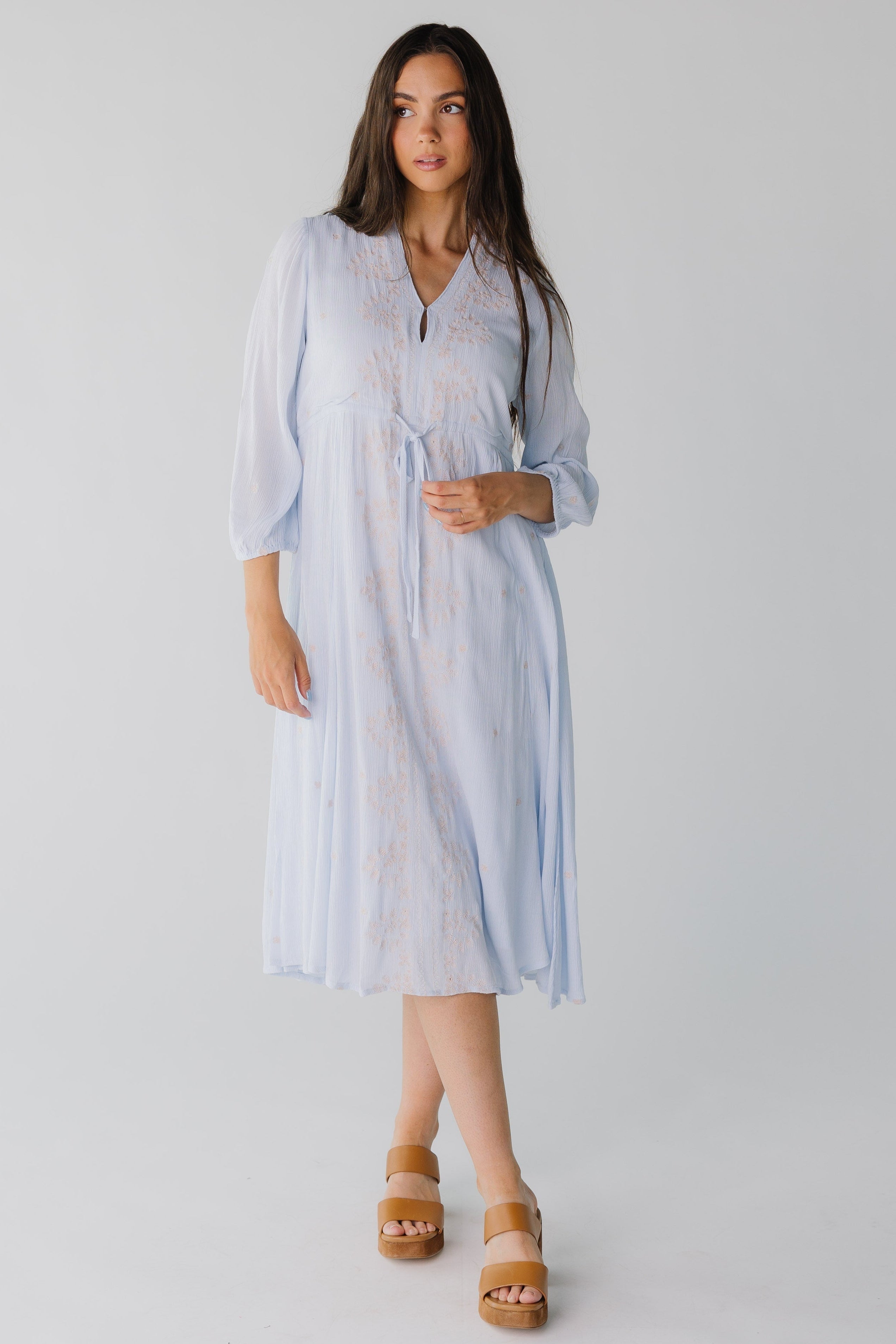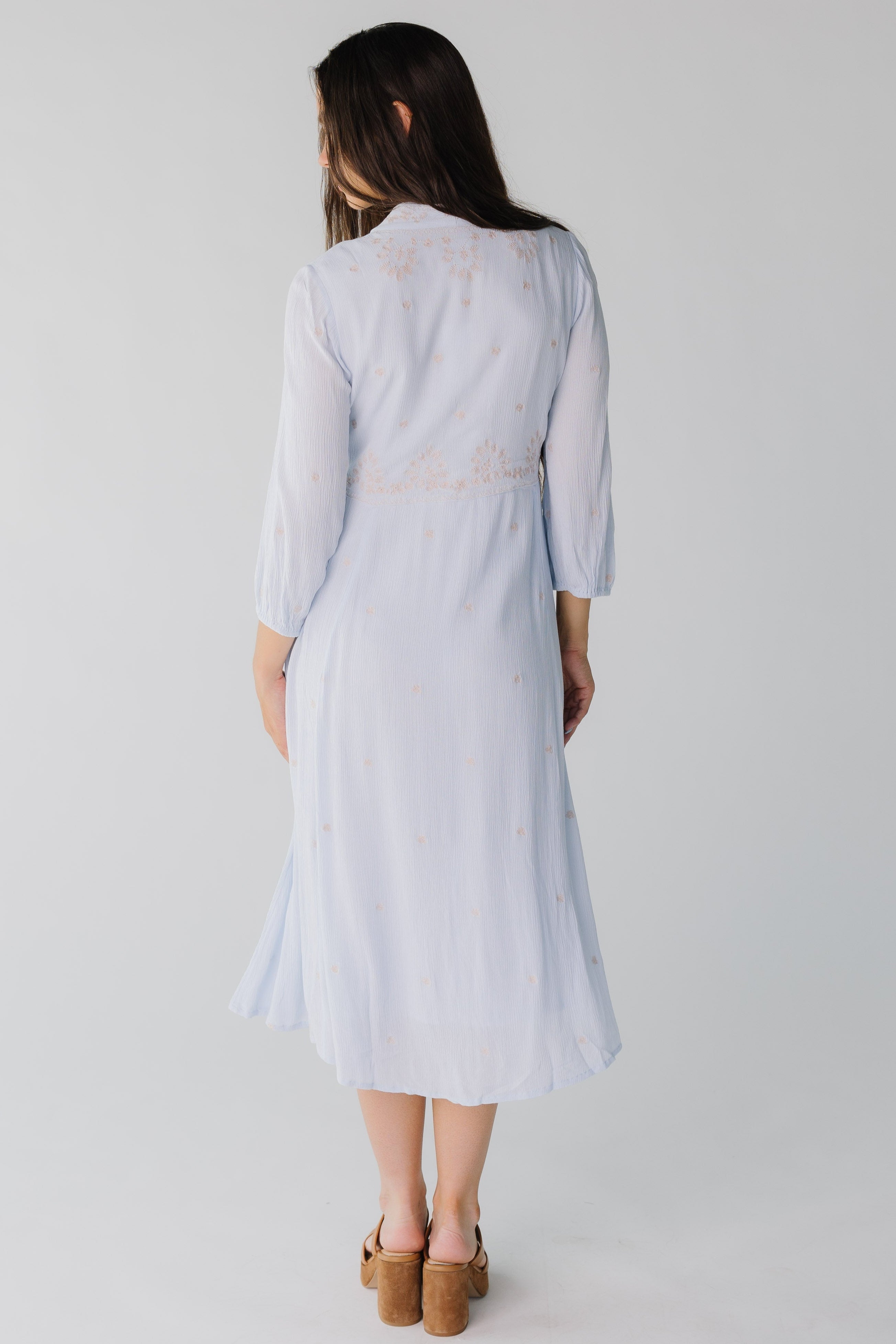 The pastel embroidery is the main feature of this lovely gauzy dress.